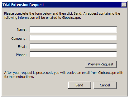 Click Send. Your request is sent to the Globalscape server, which will forward your request to an account executive. If your computer does not have access to the Internet, copy the trial extension request to a computer that has internet access and email the request to your account representative, or if you don’t have one, use the Contact Sales form online at https://www.globalscape.com/support/contact-us. After your request is processed, an account executive will send you an email with a response string.