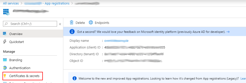 Under Client secrets, click the icon to Copy to clipboard. (You must have permission/ be the application owner to do this.)