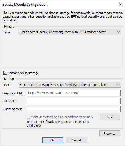 The Write secrets to backup in addition to primary check box is selected by default. Clear the check box if you do not want to write secrets to backup or if the backup vault is kept in sync by a third party, such as Azure's vault backup. If the check box is not selected, EFT will not write to backup, but will attempt to read from the backup if the primary is unavailable, which may fail if the vaults are not kept in sync by the third party.