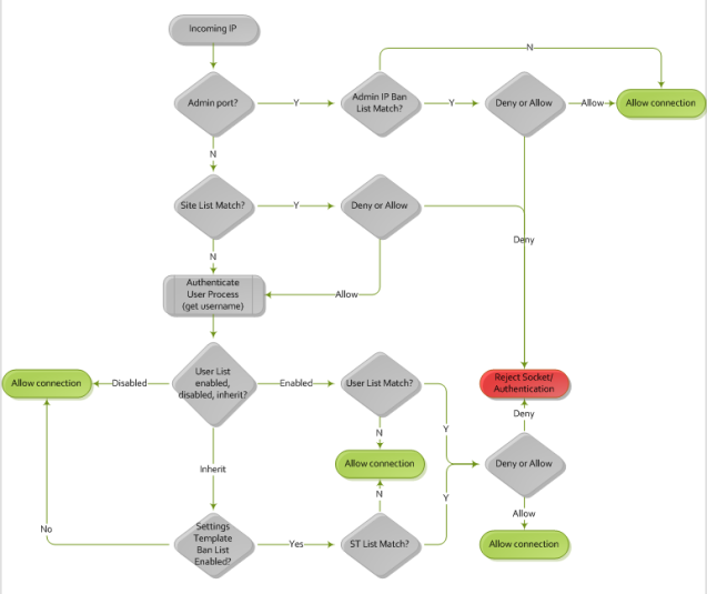 Any IP address allowed access is parsed against the Settings Template or user account IP address access/ban list upon user authentication.