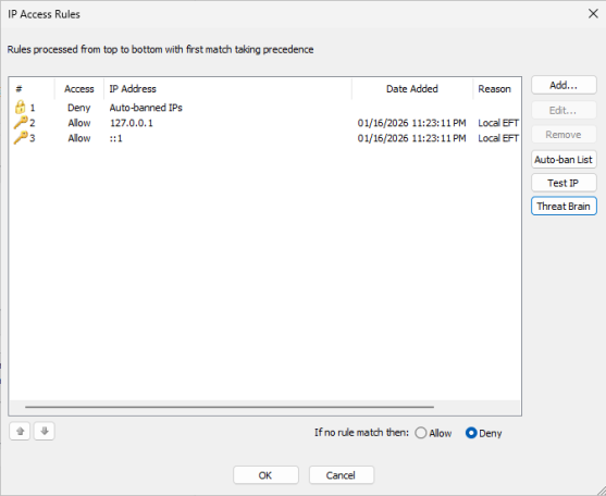 EFT filters incoming IP addresses based on the IP address entries in the list, in order of precedence. The first "Deny" match on the list causes the filtering to cease Rule matching/parsing. If there is no match or no "Deny" for the Site list, the Rule will process against either the user list (if explicitly enabled) or against the Settings Template list (if user list is set to inherit).