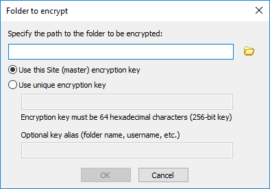 Locate your Site or specific Encrypted Folder’s encryption key. Alternatively, create a new 256-bit key (64 hexadecimal characters, i.e. 32 bytes in length).