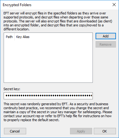 If the Advanced Property EncryptedFolderKey is defined and not malformed, EFT uses it for encryption/decryption, read at service startup. (This is mainly for EFT upgrades to 8.0.4 from earlier builds. The key can be created/edited in the Encrypted folders dialog box, as described below.)