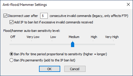 Behind the scenes, EFT applies several counters that it uses to identify possible attacks. If an attack is identified, the attackers IP is banned for a time proportionate to the sensitivity level. High sensitivity levels offer greater protection but may also result in a higher number of false positives. We recommend starting at the Medium sensitivity level, and then adjusting the slider over time as you analyze traffic patterns and characteristics.