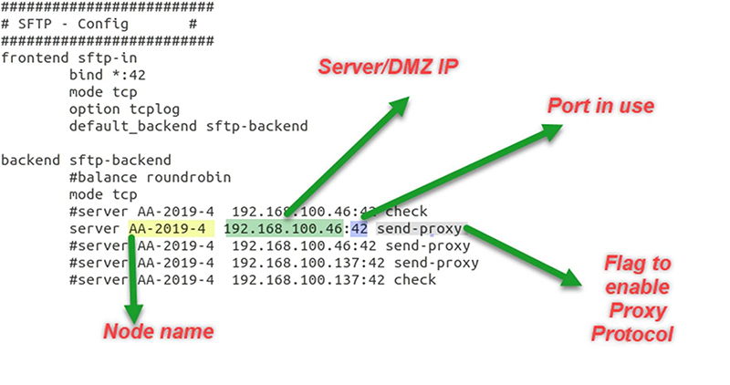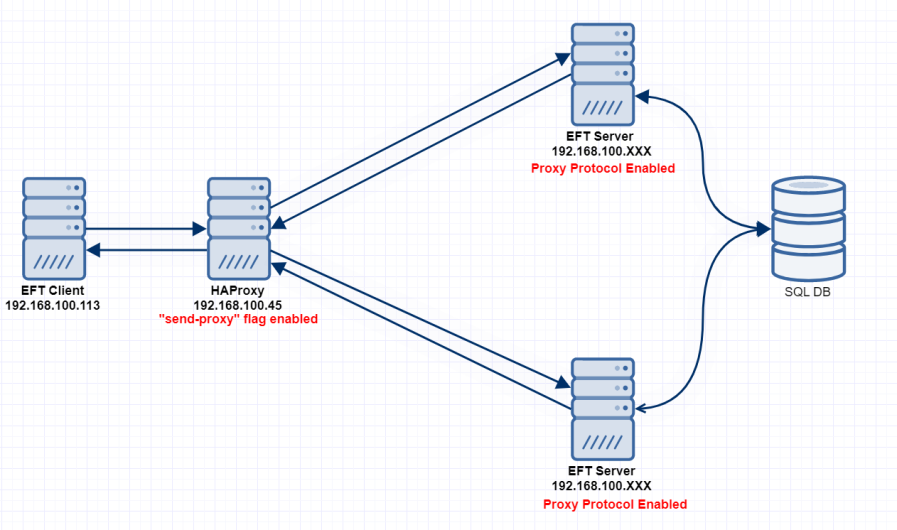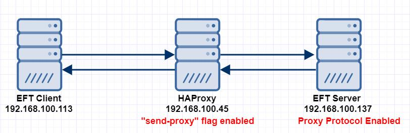 Instead of files waiting in a queue for a server to become available, load balancers for EFT HA Active-Active configuration are used to distribute traffic to available EFT servers. Adding a load balancer means that instead of EFT seeing the original client requests, it sees requests as though they had originated from the load balancer. In this case, EFT doesn't receive client information, such as IP address and port number, making it difficult to analyze traffic logs or other transfer details. Prior to EFT v8.0.5, when EFT is setup behind a load balancer, such as HAProxy or F5, when connections come in to EFT, the originating IP appears as that of proxy/LB, rather than origination client. (F5 has no native support for proxy protocol. You must create a custom i-Rule.)