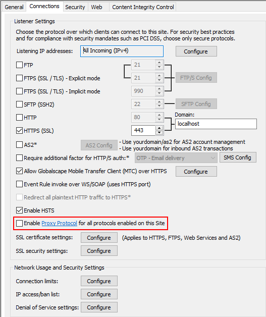 On the Site > Connections tab, select the Enable Proxy Protocol for all protocols enabled on the Site check box.