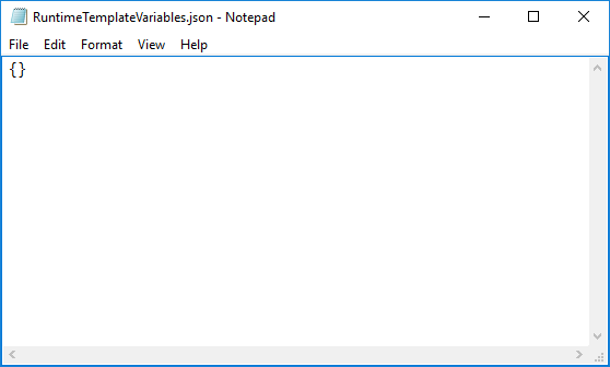 The RuntimeTemplateVariables.json file is in the format of a normal JSON file, with "name": "value". Just like the AdvancedProperties,json file, the file is empty. Only the non-default settings that you add will appear in the file. For HA installations, the file is saved in the HA shared configuration location.