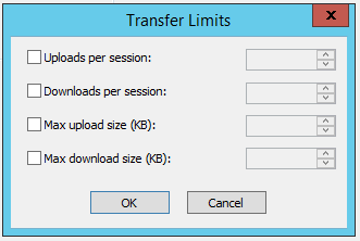 Select the Max Upload/Download Size check boxes and specify the maximum amount of data (in kilobytes) the user may transfer during a session.