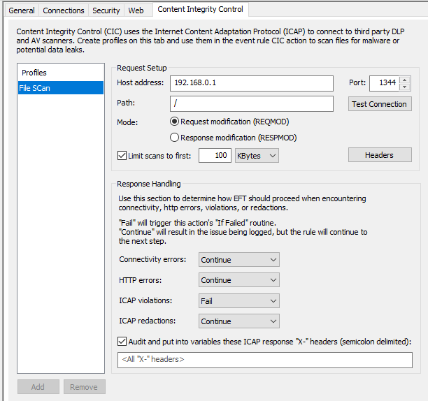 Content Integrity Control is used to send a file to an antivirus scanner or data loss prevention solution for processing. When a File Scan Action is added, a file that triggers the Event Rule is sent to an ICAP server for processing. When the file passes, other Actions can occur, such as moving the file to another location. If the file fails, processing can stop, or other Actions can occur, such as sending an email notification.