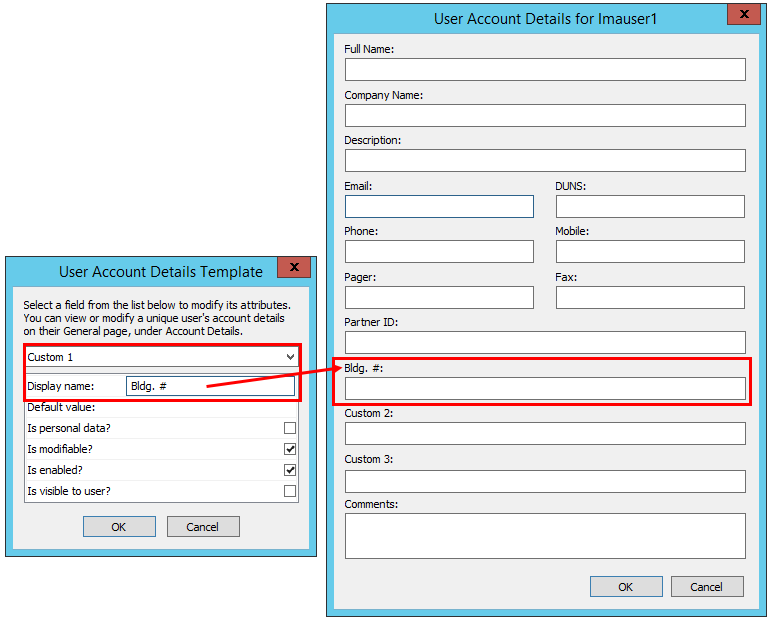 The Display name can be edited, and the change will appear in the User Account Details dialog box. However, the field name in the database will remain the same. For example, you could change Custom 1 to display the building number in which a user works. It will display the new field name in the User Account Details dialog box, but not in reports or the WTC.