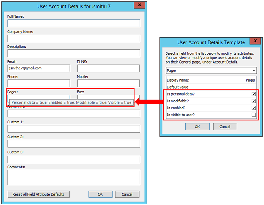 In the example below, the Pager field attribute in the User Account Details dialog box is "Visible = true" but the User Account Details Template was changed to false (cleared check box). You can leave the setting as-is in the User Account Details dialog box, or you can click Reset All Field Attribute Defaults to make the field attributes in the User Account Details dialog box match the template's settings.