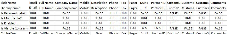 The default setting (true or false) for each field are shown in the table below:
