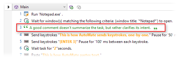 Comments are used to embed user readable annotations in the steps of a task, usually with the purpose of making the task easier to understand. Comments can be used to summarize the task, explain the intent of a specific step, document instructions, enter notes, reminders or other important information. Comments are ignored by Automate Desktop during runtime. For debugging convenience, the Comments Debug Panel displays each comment embedded in a task and their associated step number.