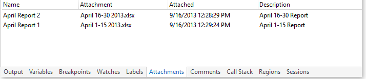 Attachments are files of any type that are wrapped and accessible from an Automate Desktop task. These files can be easily exported or deployed along with their associated task allowing them to be more transportable and manageable. At runtime, attachments are automatically "unwrapped" to a local directory where they can be accessed by the task. The Attachments debug panel displays any files that are currently attached to the task. It also allows you to add a new attachment to the task as well as modify or remove existing attachments. More on Attachments