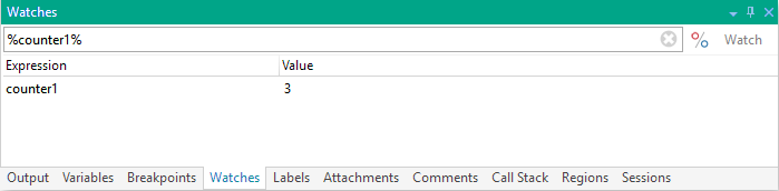 The Watches debug panel can store several variables and expressions that you want to view over the course of the debugging session. You can set a watch on a variable used in the task or you can enter an expression to create a more complex watch. You can use the Watches debug view to add, remove, or change watches. After each step executes, any variables and expressions listed are re-evaluated and updated with their current values. Watches go beyond the Variable window by providing an intuitive means of testing variable or task states while a task is executing. More on Watches