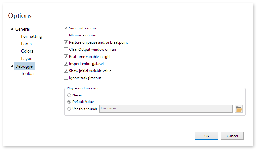 The Task Builder includes settings that affect its behavior while running a task. In some cases you may want to change these settings to better fit your debugging needs. For instance, you can opt to minimize the Task Builder window during execution to better examine an interactive task, automatically clear the Output Debug Panel after each run, or play a custom sound when an error occurs.