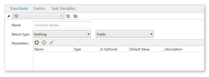 - Enter a function name, select a return type and specify whether the function is public or private (see the Function Properties table below for more details).