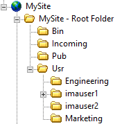 If the Settings Template home folder is defined (for example, /Usr/Marketing), then the user (client) folder appears in the Settings Template folder you've defined (/Usr/Marketing/imauser1).