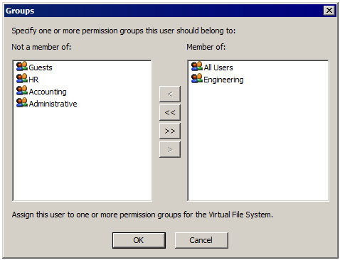 When you define a user account, you assign it to one or more permission Groups. The Group to which a user belongs determines the user's folder permissions in the Virtual File System (unless you define the user's permissions independent of a Group).