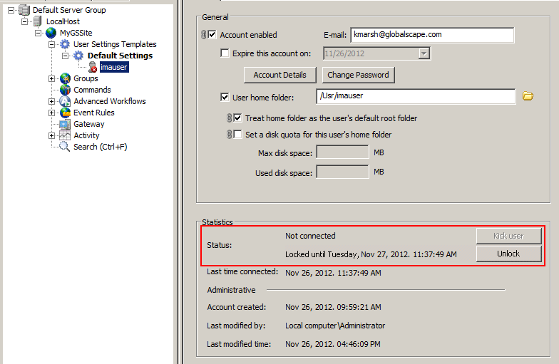 If a user account is locked out due to invalid password attempts, the user account's user icon in the tree and the user account's General tab both indicate that the account is locked. The icon in the tree has a red-circled X on it and the General tab's Statistics area indicates the date until which it is locked. (You may have to refresh the interface to see the changes. Also, the view that you see depends on your account permissions.)