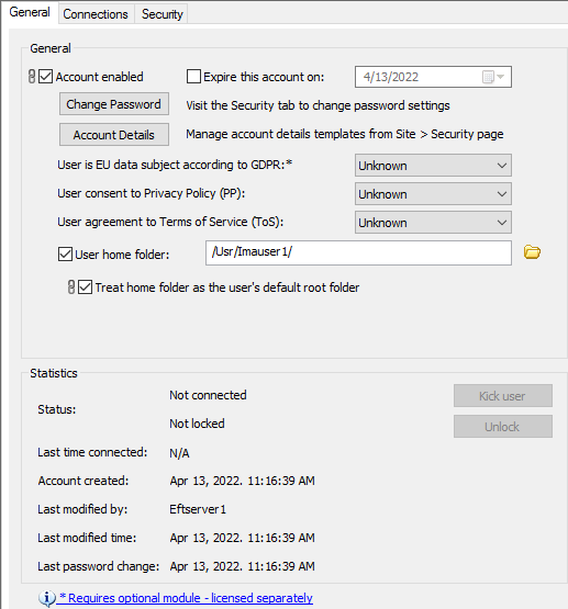 The General tab of a user account is used to enable the user account, expire the account on a specific date, specify the home folder and home folder options, set a disk quota for the user's home folder, and viewing the user's statistics. The "link" icons next to the check boxes indicate that the setting is inherited from the Settings Template. The settings apply only to the selected user. To apply the settings to multiple users, refer to General Tab of a Settings Template.