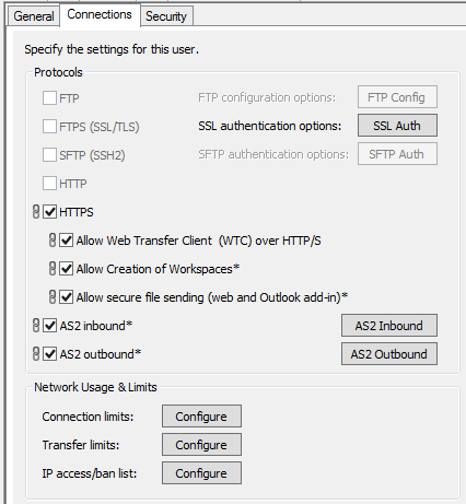 (Requires the HTTP/S module and Workspaces module) Users must log in to Workspaces via the Web Transfer Client (WTC). The EFT administrator must configure EFT to allow connections from the WTC. See also Enabling User Access to the Web Transfer Client and Enable and Configure EFT Workspaces.