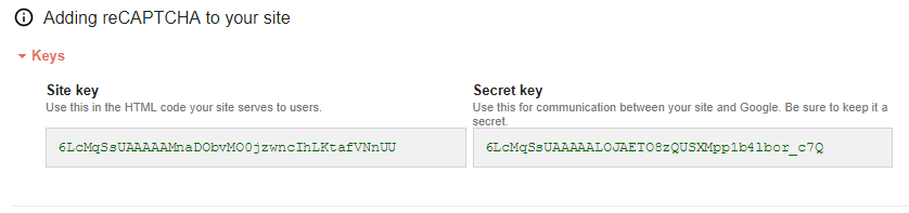 If you click Google reCAPTCHA, refer to the reCAPTCHA procedure below, then specify the following keys: