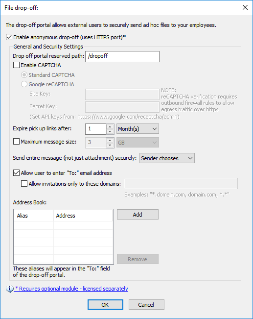 (Requires HTTPS, Workspaces) The Workspaces Drop-Off portal allows employees and partners to send files to internal users, with no attachment limits. The transfer of the email and attachments is encrypted and secure. The Drop-Off portal is configured at the Site level on the Web tab.