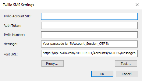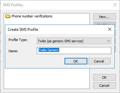 - Modify - Opens the Twilio SMS Settings dialog box for a selected profile.