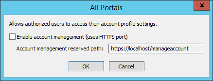 Select the Enable account management page over HTTPS check box. The Account management reserve path URL is displayed in the text box (for example, https://localhost/manageaccount). The URL is not editable, but you can select and copy it to provide to users.
