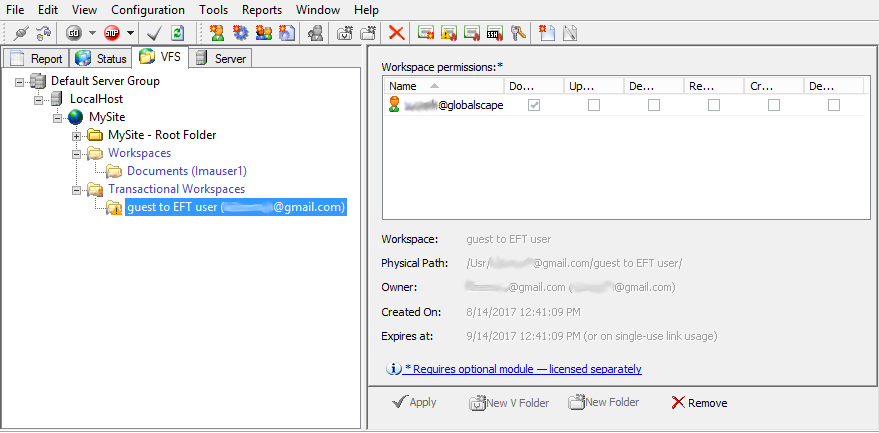 (Requires HTTP/S, Workspaces) A Transactional Workspaces is a special kind of Workspace that results from sending a file for pick up from the EFT Outlook Add-In or Drop-Off portal. The recipient only has download permission on the file(s) received. Transactional Workspace participants cannot see each other and cannot subscribe to notifications.