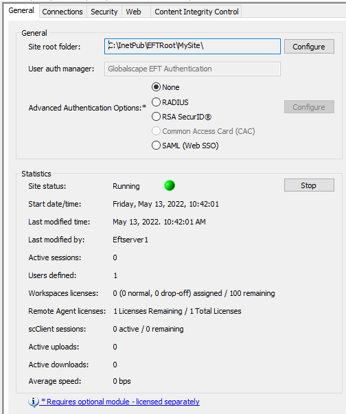 In the EFT trial, you have a 100-seat license, meaning 100 users can create Workspaces. After you activate EFT, you get the number of licenses that you purchased. Activation of the HTTP/S module includes 5 Workspaces licenses.