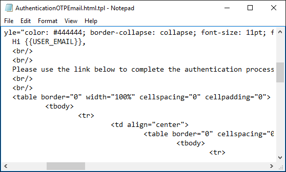 In the General Settings area, next to Authentication OTP message, click the browse icon. Your default text editor (for example, Notepad) opens with the message text in HTML.