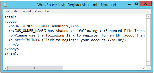 Edit the text as needed, being careful not to delete the variables (%USER.EMAIL_ADDRESS%, %WS_OWNER_NAME%, %FOLDER_NAME%, %LINK%), then save the file and close the text editor.