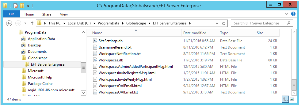 The templates are stored in \ProgramData\Globalscape\EFT Server or your cluster share under Templates, and apply to all Sites on the Server.