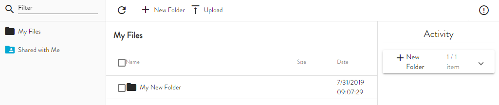 The new folder appears in the right pane, and the Activity pane indicates that you created a new folder. (Click the information icon to open the Activity pane.) You can now move files between folders and upload files to the new folder.