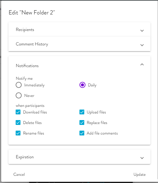 Each Workspace participant can configure notifications to let them know when actions are performed on the Workspace, such as uploading or downloading. The notifications are set to Daily for all actions by default.