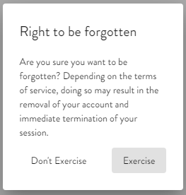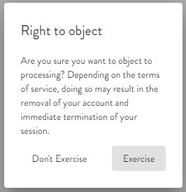 Object to usage of personal data - Depending on the Terms of Service, objecting to the use of your personal data may result in the removal of your account and termination of the current session to which you are logged in. If you are unsure, click Don't Exercise and contact the administrator. Otherwise, click Exercise.