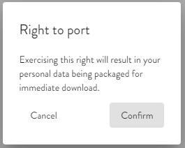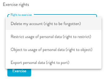 The Exercise rights area enables you to exercise your rights to delete your account from the server, restrict use of personal data, object to use of personal data, and export your personal data. Each right is described below.