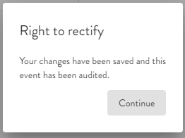 The Personal data on file area indicates which data is stored in EFT. By default the data is stored encrypted. If you change any of the settings, the Right to rectify message appears.