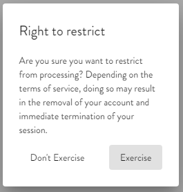 Restrict usage of personal data - Depending on the Terms of Service, restricting the use of your personal data may result in the removal of your account and termination of the current session to which you are logged in. If you are unsure, click Don't Exercise and contact the administrator. Otherwise, click Exercise.