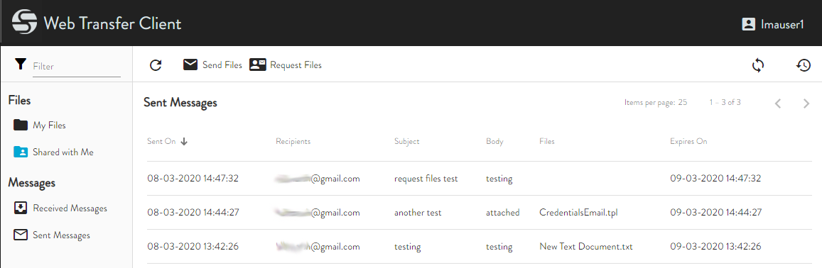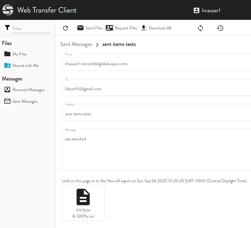 Workspaces users can view a list of the messages they have sent, and their attachments. Once the items expire (if the EFT or user have set an expiration), those items are no longer viewable.