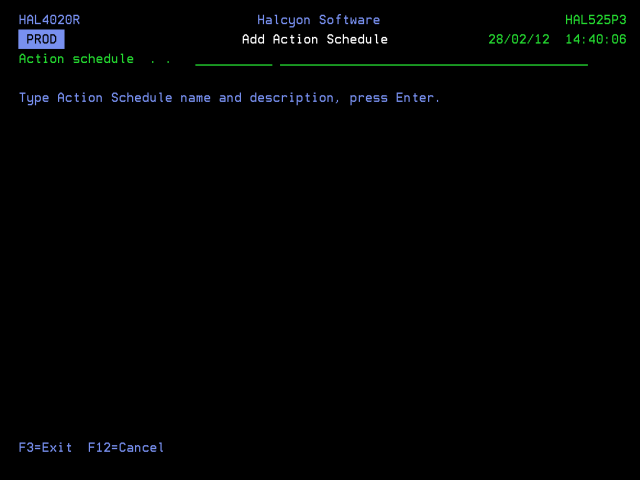 To create a new action schedule, use F6=Add on the main Work with Action Schedules display.
