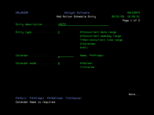 Enter the name of the calendar to use and the calendar mode. When calendar mode is N=Normal, the dates and times set on the calendar are used. When calendar mode is I=Inverse, the dates and times not set on the calendar are used.