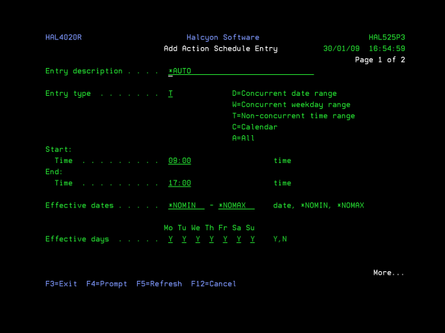 | T=Non-concurrent time range | Specifies repeating ranges starting at a specified time and running continuously to another time up to 24 hours later. The same range repeats on the days specified by the ‘Effective days’ parameters, dates by the ‘Effective dates’ parameters. The range may be contained within a day, for example 0900-1700, or may start one day and end the next, for example 1900-0600 |