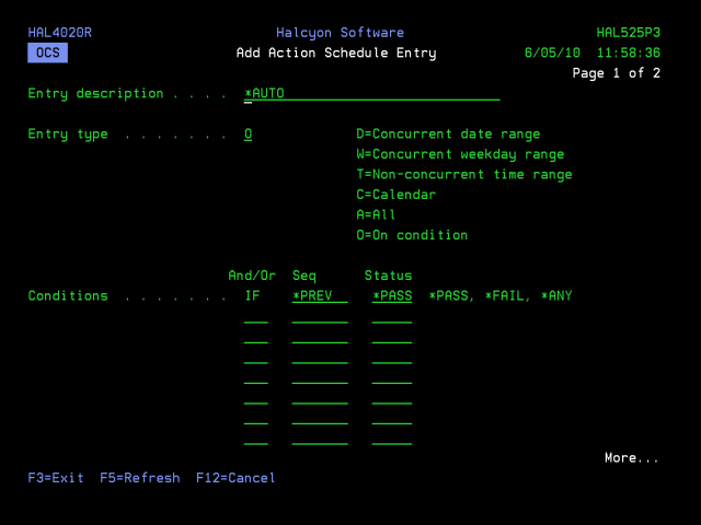 Conditional entries are only allowed in action schedules that have ‘Action select’ *ALL specified. Conditional entries are not allowed when ‘Action select’ is specified as *FIRST.