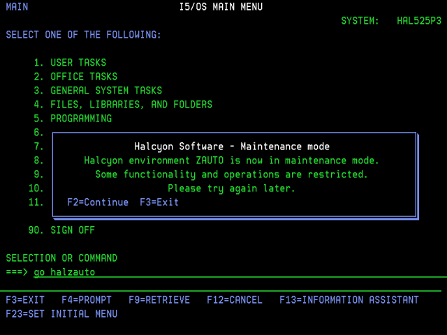 Maintenance Mode allows you to prevent changes within an Environment. Maintenance Mode is switched on and off via the ‘Set Maintenance Mode’ (SETMNTMDE) command within the HALPROD library (where PROD is the name of your environment).