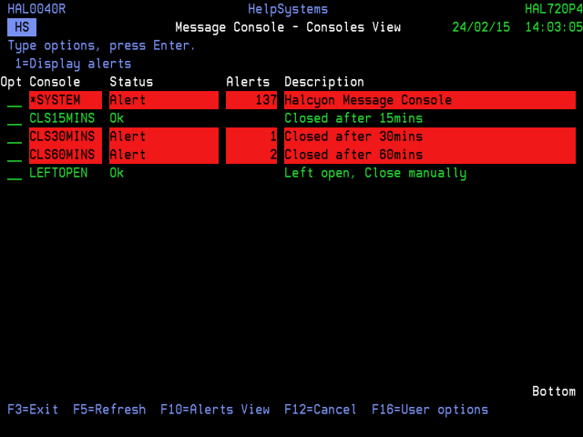 To switch to the alert display, use F10=Alerts to display all alerts or use 1=Display Alerts to display only the alerts for the selected sub-console.