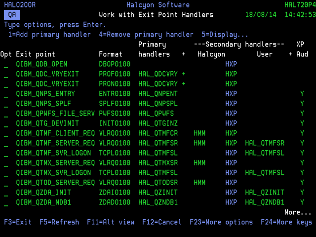 If an exit point already has the maximum permitted number of exit points and less than four user-defined secondary handlers, you are prompted to allow the first existing exit program to be changed into a user-defined secondary handler, in order to free up a slot for the Halcyon primary handler. Press F2 when prompted to allow this amendment.