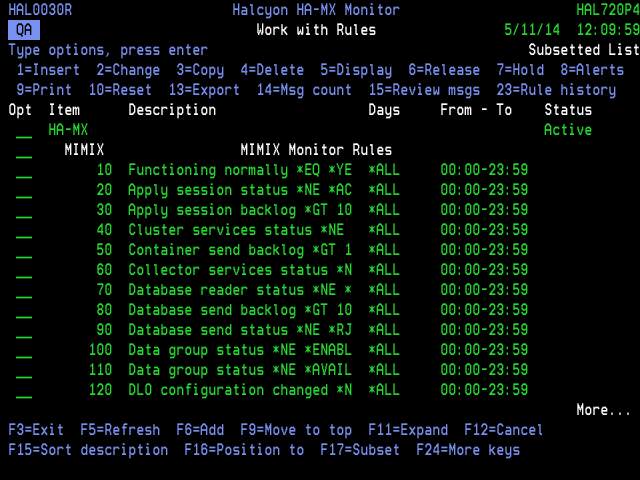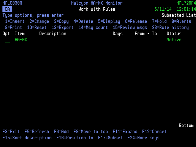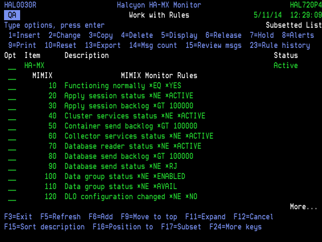 Working with Rules allows you to define and maintain rules for Halcyon HA-MX Monitor. The Work with Rules option is accessed from option 5=Work with Rules from the main HA-MX Monitor menu.
